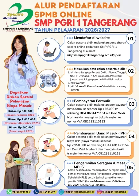 - OFFLINE (datang langsung ke SMP PGRI 1 Tangerang di jam kerja) dengan membawa persyaratan Fotocopy Kartu keluarga, KTP orang tua, Ijazah/SKHUN SD (bisa menyusul), dan Akta kelahiran